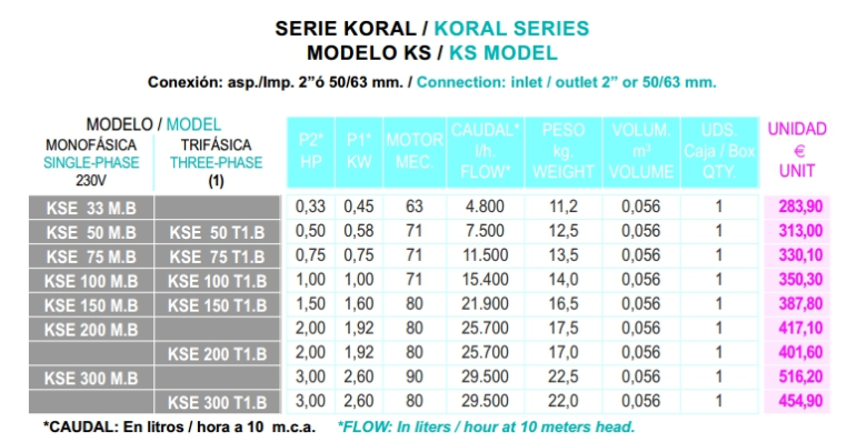 Thông số sản phẩm của máy bơm Kripsol KSE dòng MODEL khác