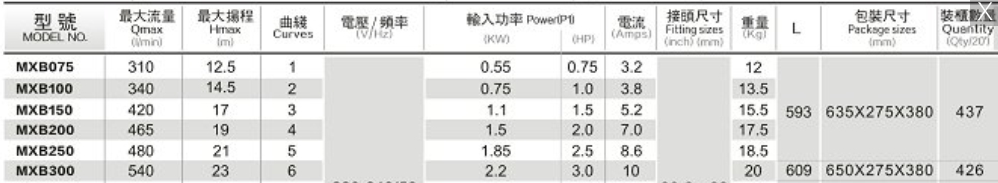 Thống số kỹ thuật máy bơm bể bơi MXB Các model khác